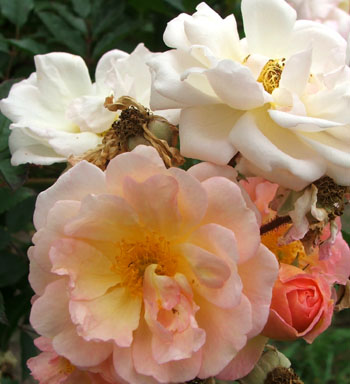 I like the slightly dishevelled look of her flower clusters, the texture of her leaves, and the mess of her colours - one bloom apricot-pink, the next soft yellow, pale cream, orangey-yellow, pale buff, or white...